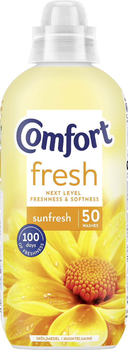 Comfort Sunfresh -huuhteluaine tekee pyykistäsi ihanan pehmeää ja antaa intensiivistä raikkautta joka pisarassa. Comfort Sunfresh on täydellinen huuhteluaine sinulle, joka arvostat ihanan ilmavaa ja pehmeää pyykkiä. Kun vaatteesi tuoksuvat hyvältä, tunnet myös olosi hyväksi – koko päivän. Siksi olemme kehittäneet Comfort Sunfresh -huuhteluaineen, joka tekee vaatteistasi raikkaita, pehmeitä ja tuoksuvia. Pitkäkestoinen puhdas ja mieto tuoksu, raikkaat ja pehmeät vaatteet ja tekstiilit. Comfort Sunfresh -huuhteluaineessa on kerroksellinen tuoksumaailma. Ylätuoksu sisältää mandariinia, keskituoksu jasmiinia ja setriä. Aisti luonnollinen ja raikas tuoksu, jota rakastat ympäri vuoden. Comfort on huuhteluaine, jolla on pehmentävä vaikutus pyykkiisi. Se silottaa vaatteiden kuituja, tekee niistä erityisen ilmavia, poistaa ryppyjä ja helpottaa silitystä. Huuhteluaine vähentää sähköisyyttä, suojaa pahoilta hajuilta ja auttaa säilyttämään vaatteidesi värin ja muodon, pesu pesulta. Suositun Comfort-huuhteluaineen uusi, parannettu koostumus tarjoaa täydellisen suojan vaatteillesi, jotta voit nauttia pidempään kestävästä raikkaudesta. Huuhteluaine on tiiviste, mikä pienentää pakkausta ja annostusta. Pullo on valmistettu 100 % kierrätettävästä muovista, etikettejä lukuun ottamatta. Käytä seuraavasti: Kaada 15 ml:n annos Comfort-huuhteluainetta suoraan pesukoneen huuhteluainelokeroon suosikkipesuaineesi viereen. Älä kaada suoraan kankaalle. Valitse ohjelma ja anna koneen hoitaa loput. Comfort on aito ja alkuperäinen huuhteluaine, jota on käytetty vaatteiden hoidossa yli 50 vuoden ajan. Yhdestä Comfort-huuhteluainepullosta saat 41 pesua. Comfort-huuhteluaineen edut • Tekee vaatteista ja pyyhkeistä pehmeitä ja tuoksuvia • Vähentää staattista sähköä • Helpottaa vaatteiden silitystä ja muuta vaatehuoltoa • Säilyttää tekstiilien värin ja muodon • Antaa vaatteille raikkautta, joka kestää koko päivän • Suojaa hajuilta