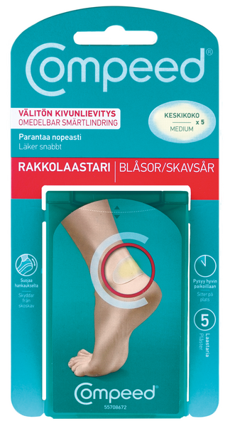 COMPEED® Medium rakkolaastari on suunniteltu erityisesti kantapäässä oleville rakoille. COMPEED®-rakkolaastari imee ylimääräisen kosteuden ja muodostaa suojaavan pehmusteen sekä lievittää välittömästi kipua ja luo optimaaliset olosuhteet jalkarakkojen paranemiselle. Polyuretaanista valmistettu rakkolaastari sisältää hydrokolloidihiukkasia, jotka imevät jalkarakosta erittyvää solunestettä. Hydrokolloidihiukkaset muodostavat laastarissa geeliä, joka muodosta pehmeän tyynyn hiertymän päälle. Tyyny suojaa rakkoa paineelta ja kivulta sekä lialta ja bakteereilta. Lisäksi se on vedenkestävä. Muotoiltu ja hengittävä rakkolaastari takaa optimaalisen paranemisympäristön. Rakko ei kuivu eikä rupeudu hydrokolloidigeelin takia. Siksi rakko myös paranee nopeammin kuin tavallista laastaria käytettäessä. Compeed®-laastareita ei kannata koskaan leikata pienemmiksi koska niiden pito ja istuvuus kärsii. Tarjolla on monia eri kokoja erikokoisten rakkojen hoitoon. Diabeetikoiden tulee keskustella lääkärin kanssa ennen käyttöä. Älä käytä tulehtuneeseen haavaan. Jos rakko pahenee tai ei parane, lopeta käyttö ja ota yhteyttä lääkäriin.