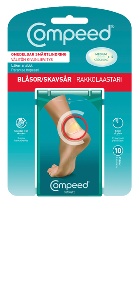 COMPEED® Medium -rakkolaastari toimii kuin toinen iho. Imee ylimääräisen kosteuden ja muodostaa suojaavan pehmusteen sekä lievittää välittömästi kipua ja luo optimaaliset olosuhteet jalkarakkojen paranemiselle.