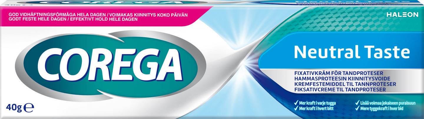 Jos proteesisi lonksuu tai ruoantähteitä pääsee ikenien ja proteesin väliin, Corega Neutral Taste auttaa. Tiiviin kiinnityksen ansiosta ruoanmurusia ei pääse proteesin alle. Ei vaikuta ruoan makuun eikä sisällä keinotekoisia väriaineita. Voi parantaa hammasproteesin istuvuutta ja mukavuutta ja suojaa ikeniä ärsytykseltä koko päivän ajan.
