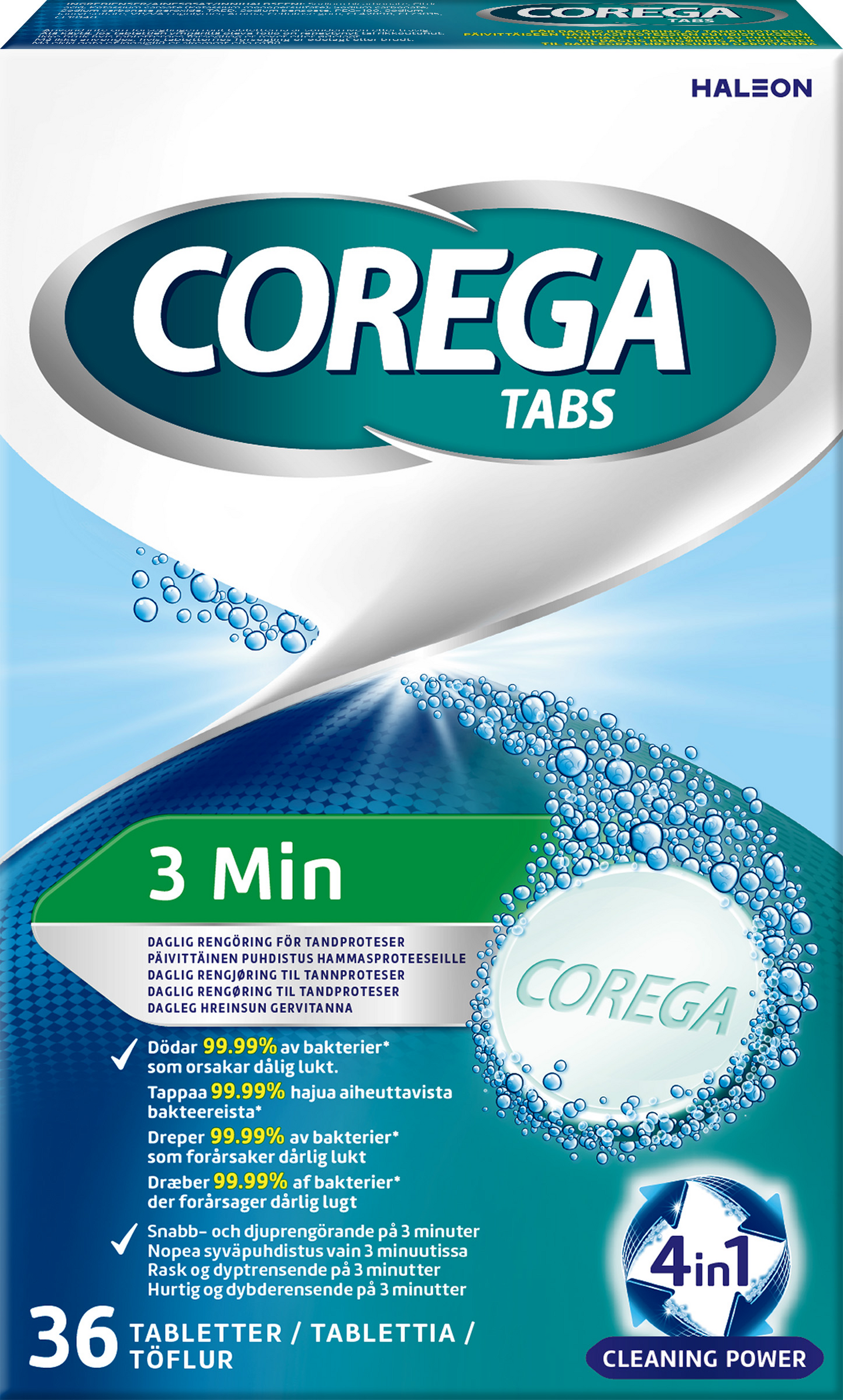 Corega 3 Minutes -puhdistustablettien äärimmäisen nopeasti toimiva koostumus tappaa 99,99 % pahanhajuista hengistystä aiheuttavista bakteereista* vain 3 minuutissa ja muita mikrobeja 5 minuutissa käyttöohjeiden mukaan käytettynä. Lisäksi Corega 3 Minutes poistaa vaikeita värjäytymiä ja antaa raikkaan tunteen, jotta voit huoletta mennä lähelle sinulle tärkeitä ihmisiä. Hammasproteesin puhdistaminen Corega-puhdistustableteilla osana päivittäistä suuhygieniaa auttaa parantamaan suunterveyttä.