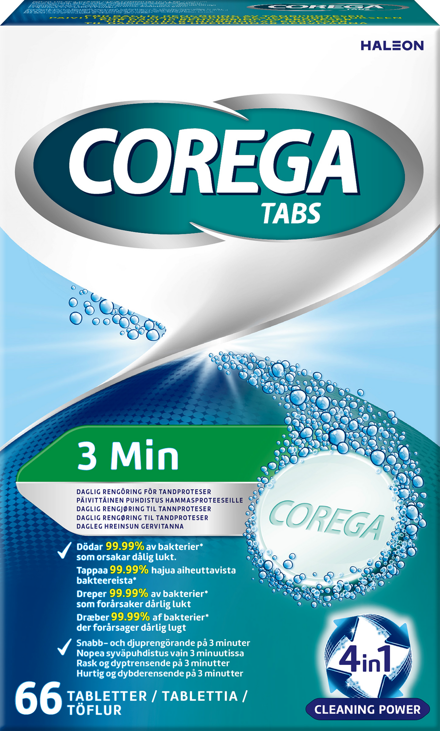 Corega 3 Minutes -puhdistustablettien äärimmäisen nopeasti toimiva koostumus tappaa 99,99 % pahanhajuista hengistystä aiheuttavista bakteereista* vain 3 minuutissa ja muita mikrobeja 5 minuutissa käyttöohjeiden mukaan käytettynä. Lisäksi Corega 3 Minutes poistaa vaikeita värjäytymiä ja antaa raikkaan tunteen, jotta voit huoletta mennä lähelle sinulle tärkeitä ihmisiä. Hammasproteesin puhdistaminen Corega-puhdistustableteilla osana päivittäistä suuhygieniaa auttaa parantamaan suunterveyttä.