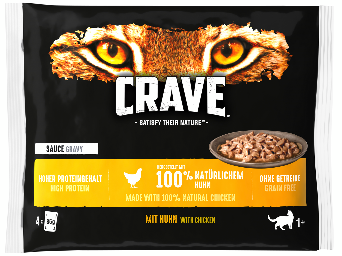 CRAVE Adult kissan märkäruoka perustuu kissojemme villien esi-isien ruokavalioon. Kissan märkäruoassamme on ainakin 65% eläinperäisiä ainesosia ja korkea proteiinipitoisuus, joka auttaa vahvistamaan kissasi lihaksia terveellisesti.