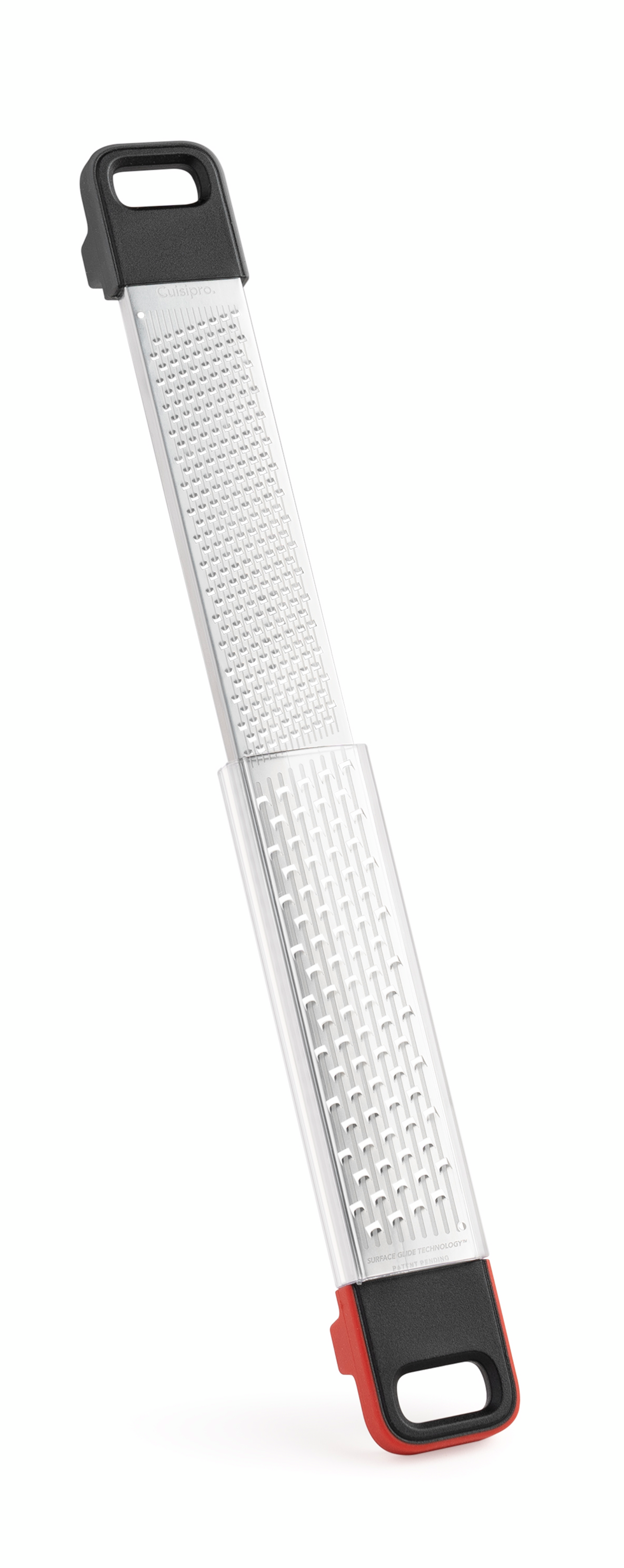 Käsisuojalla varustettu Deluxe Dual -raastin yhdistää kaksi eninten käytettyä raastinkarkeutta; hienon ja karkean. Hieno raastinosa sopii erinomaisesti mm. sitruunankuoren, suklaan tai muskottipähkinän raastamiseen, kun taas karkea on parhaimmillaan esim. pehmeitä juustoja ja vihanneksia raastettaessa. Cuisipron ainutlaatuinen, patentoitu uurrettu raastinpinta (SGT, surface glide technology) yhdistettynä veitsenteräviin etsattuihin raastinteriin takaa tehokkaan ja miellyttävän raastamiselämyksen - enemmän raastetta vähemmällä vaivalla. Raastimen molemmissa päissä on pienet jalat, jotka helpottavat raastimen tukemista pöytää tai leivontakulhoa vasten. Raastin kestää konepesun astianpesukoneen ylätasolla, mutta suosittelemme käsinpesua parhaan terävyyden säilyttämiseksi. Muoviselle käsisuojalle suosittelemme puhdistusta käsin tai astianpesukoneen ylätasolla matalassa pesulämpötilassa. Irrota käsisuoja raastimesta pesun ajaksi. Raastimen pituus 36,5 cm.