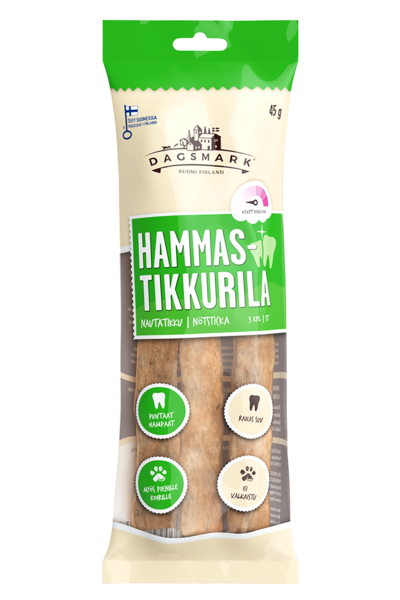 Dagsmark DENTALTIKKU nauta on viljaton koiran puruherkku. Valmistettu jauhamalla naudannahasta, sen kolmiomuotoilu tukee koiran hampaiden mekaanista puhdistumista. Sisältää natriumheksametafosfaattia, joka tukee suun luonnollista puhtautta ja auttaa pehmentämään hammaskiveä. Soveltuu myös kevyelle puruvoimalle.