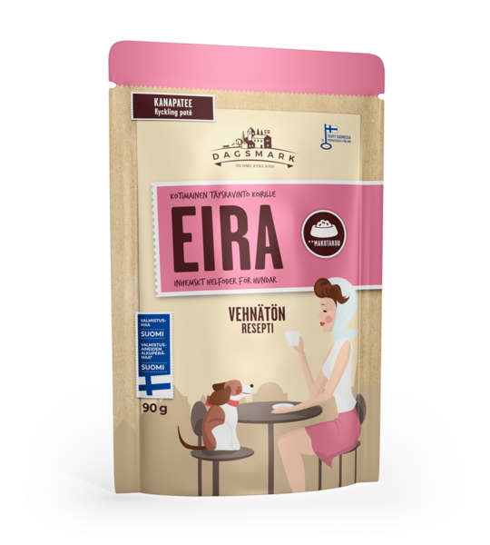 Kotimainen koiran patee koirasi hyvinvointia ajatellen. Ruoassa on maukas ja proteiinipitoinen koostumus. Kana on kasvatettu ilman antibioottia. Ruoka sisältää kaikki koirasi tarvitsemat kivennäisaineet sekä vitamiinit. Dagsmark EIRA ei sisällä soijaa, lisättyä sokeria, säilöntä- tai väriaineita.