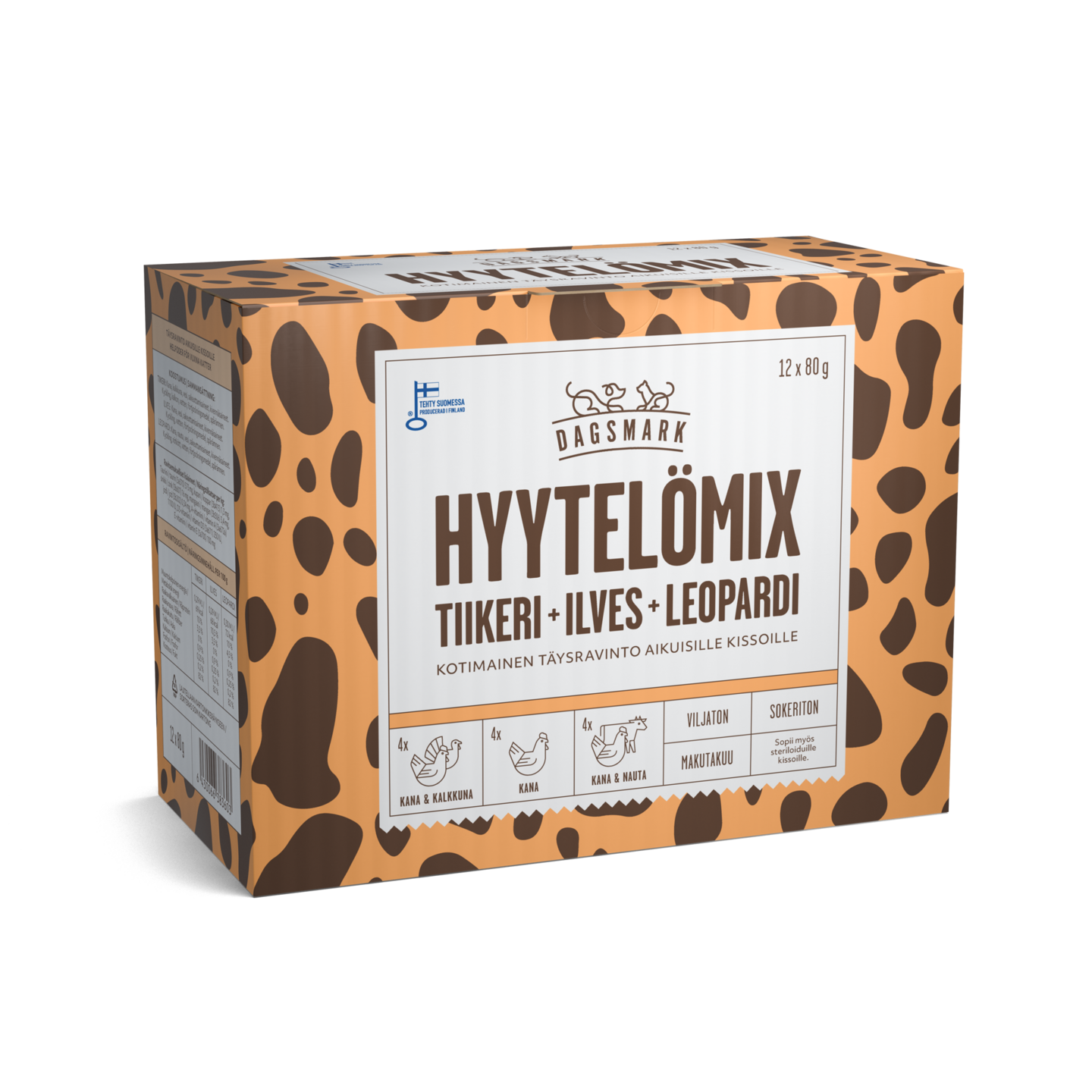 Kotimainen lajitelma kissan täysravintoa hyytelössä. Ruoassa on maukas ja proteiinipitoinen koostumus. Ruoka sisältää kaikki kissasi tarvitsemat kivennäisaineet sekä vitamiinit. Ruoka ei sisällä viljaa, soijaa, lisättyä sokeria, säilöntä- tai väriaineita.