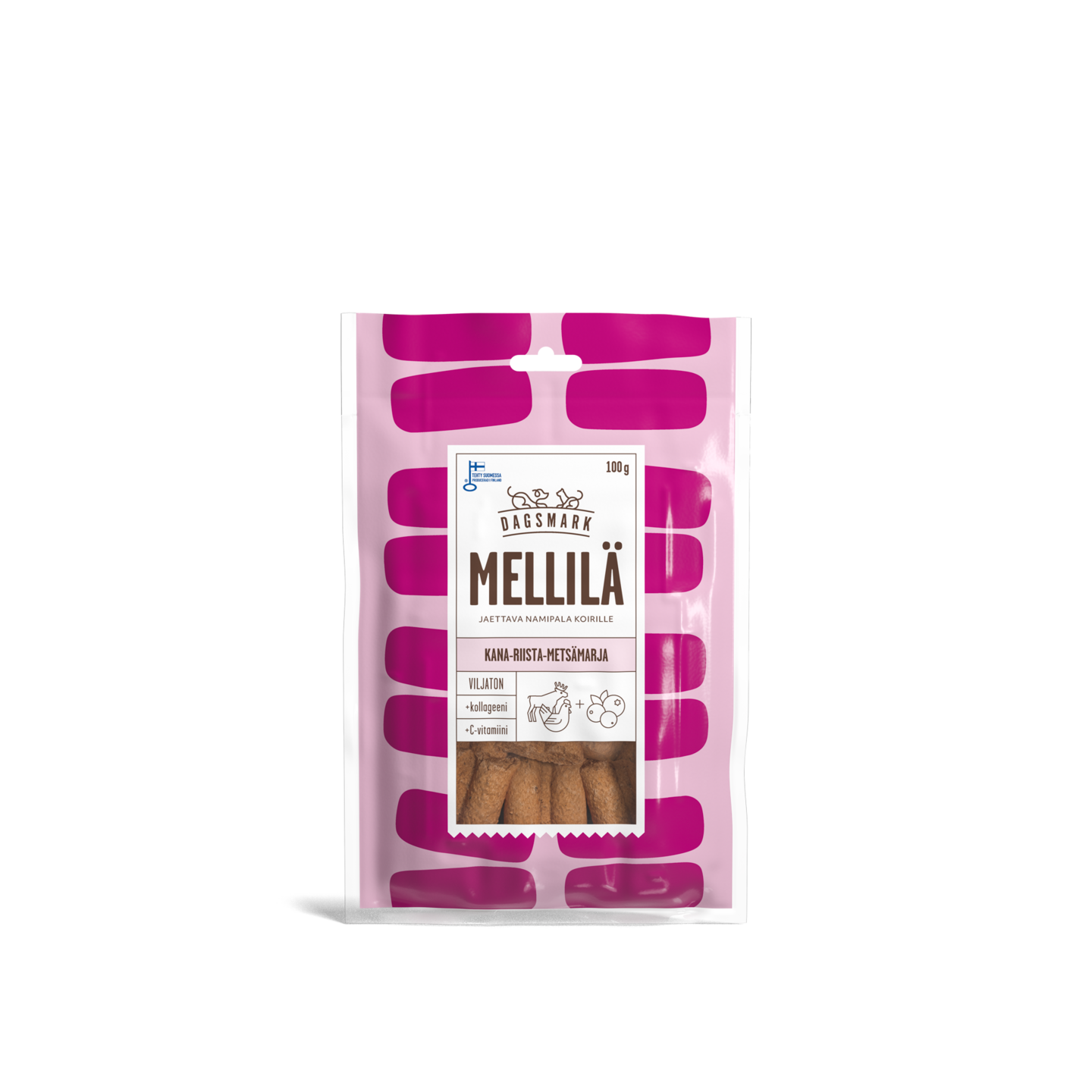 Kotimaiset Dagsmark MELLILÄ kana-riista-metsämarjanamit ovat mitä maistuvimpia herkkuja koirallesi. Niissä on käytetty proteiinina maukasta suomalaista kanaa. Metsämarjoina on kotimaista metsämustikkaa, puolukkaa ja variksenmarjaa, jotka ovat oikeita vitamiinipommeja. Lisäksi mukana on C-vitamiinia ja kollageenia, jotka pitävät huolta niin nivelistä kuin ihosta.
