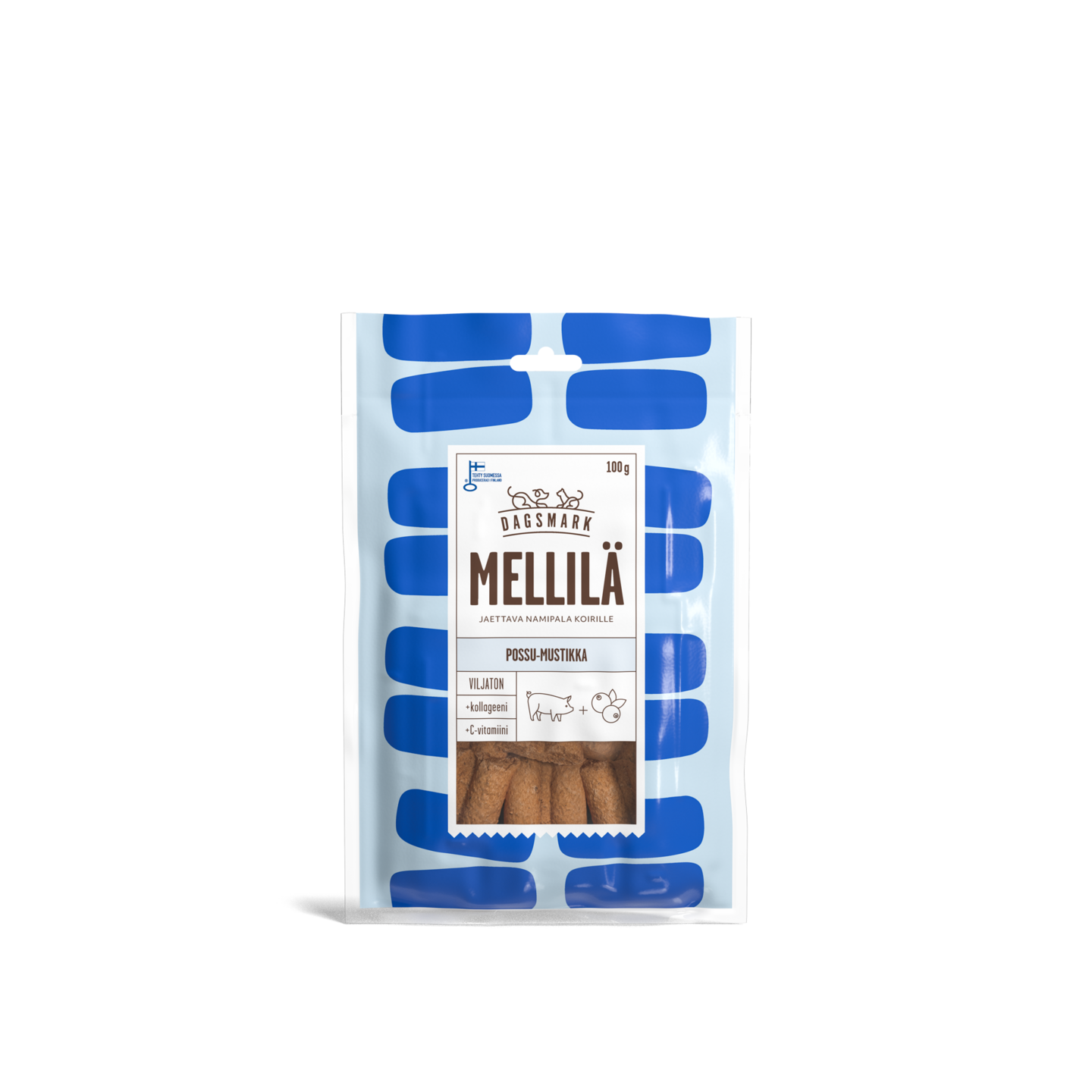Kotimaiset Dagsmark MELLILÄ -possu-mustikkanamit ovat lihaisia makupaloja kotimaisesta possusta. Nämä namit ovat täysin kanattomia. Possun makuparina on kotimainen mustikka, jonka vitamiinit hellivät koiraasi. Lisäksi mukana on C-vitamiinia ja kollageenia, jotka pitävät huolta niin nivelistä kuin ihosta.