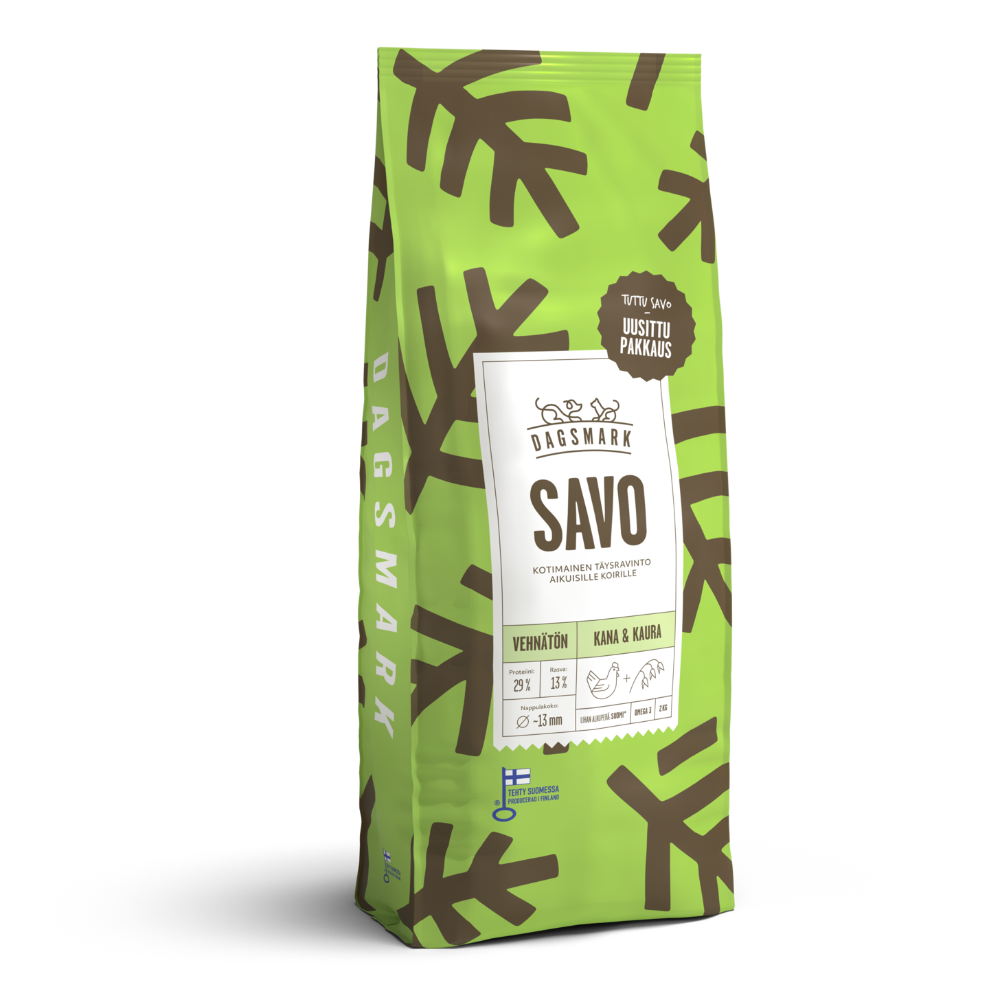 Dagsmark SAVO on kotimaista kanaa ja kauraa sisältävä kuivaruoka. Kotimainen kaura on luontaisesti gluteenitonta ja tunnetaan vatsaa hellivistä kuiduistaan, ja se sopiikin myös monelle herkkävatsaiselle koiralle. Kotimainen camelinaöljy on hyvä omega-3- ja 6-rasvahappojen lähde, jotka ravitsevat koiran turkkia ja ihoa.