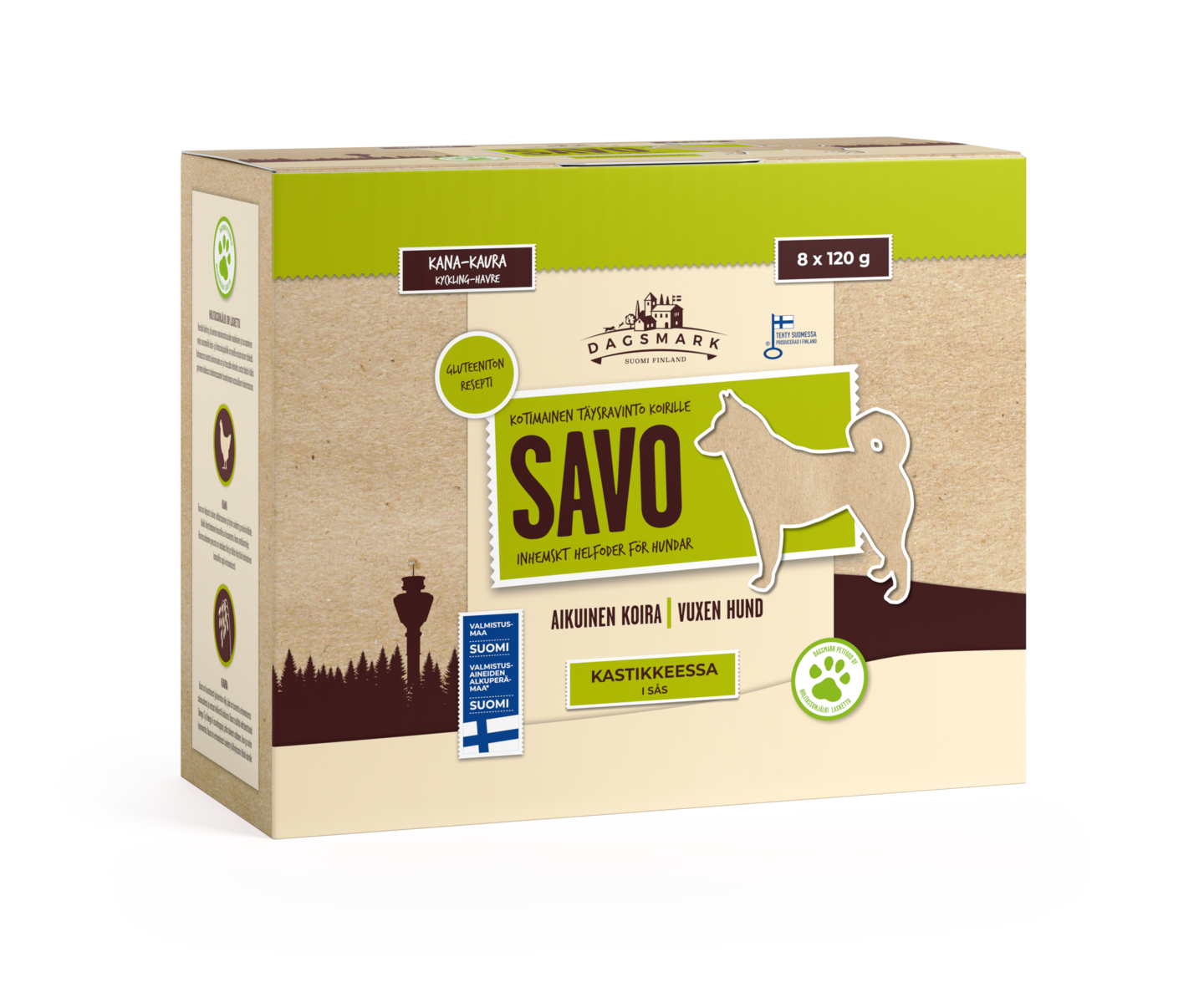 Kotimainen koiran märkäruoka koirasii hyvinvointia ajatellen. Ruoassa on maukas ja proteiinipitoinen koostumus. Dagsmark SAVO sisältää suomalaista maistuvaa kanaa ja kauraa kastikkeessa. Kana on kasvatettu ilman antibioottia. Ruoka sisältää kaikki koirasi tarvitsemat kivennäisaineet sekä vitamiinit. Dagsmark SAVO ei sisällä soijaa, lisättyä sokeria, säilöntä- tai väriaineita.