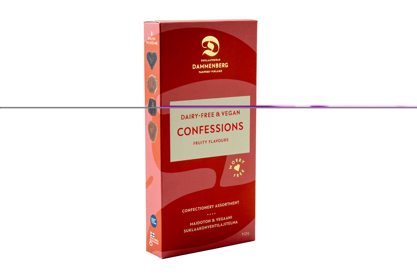 Dammenberg vegaani, pähkinätön, gluteeniton, kananmunaton, soijaton, maidoton valko kaakao konvehti.