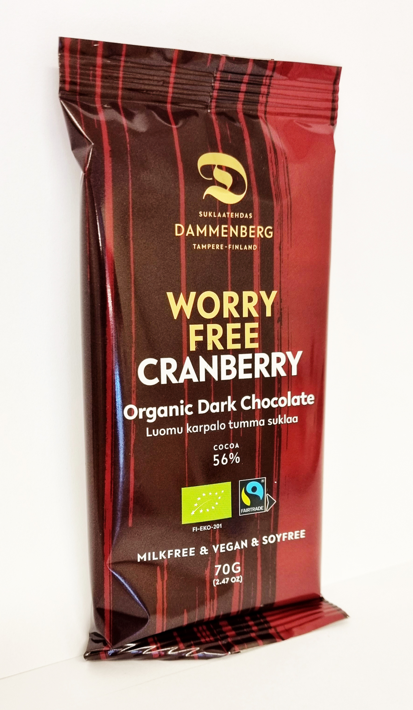 VegaaninenLuomu, reilun kaupan karpalo tummasuklaa 56 %. Täysin allergiavapaa: pähkinätön, gluteeniton, kananmunaton, maidoton, vegaani, soijaton, vanilijaton.