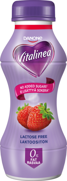 Vitalinea Mansikka juotava jogurtti on kätevä ja kevyt välipala, joka ihastuttaa maullaan. Vitalinea juotavat jogurtit ovat laktoosittomia ja rasvattomia. Niissä ole lisättyä sokeria vaan ne sisältävät makeutusaineita.