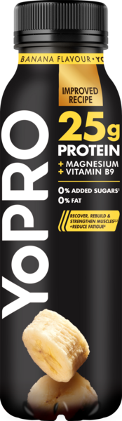 Kokeile YoPRO banaani runsasproteiinista juotavaa jogurttia, joka on täydennetty magnesiumilla ja B9-vitamiinilla!