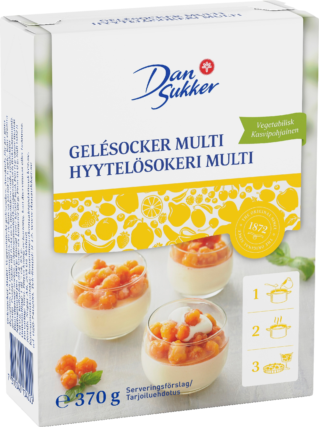VegaaninenDansukker Hyytelösokeri Multi on 100 % kasvipohjainen tuote. Sen avulla voit valmistaa helposti hyytelöitäviä, kermapohjaisia jälkiruokia, kuten kermavanukkaita, mousseja ja pehmeitä torttutäytteitä. Myös herkullinen pannacotta syntyy vaivattomasti Hyytelösokeri Multilla (ohje pakkauksessa). Hyytelösokeri Multilla syntyvä hyytelö on pehmeää ja ”lusikoitavaa”, joten tuote ei sovellu kiinteämpää rakennetta vaativien, leikattavien hyytelökakkujen valmistamiseen. Hyytelösokeri Multin hyytelöimisaineina on karrageeni ja johanneksenleipäpuujauhe. Se ei sovi säilöntään. Tuote sopii myös kakkukiilteisiin (käytä 1 dl Hyytelösokeri Multia/1–1,5 dl vettä) ja marjajälkiruokiin (1 dl Hyytelösokeri Multia/2 dl vettä), kun haluat makeamman lopputuloksen kuin Dansukker Hyytelösokerilla.