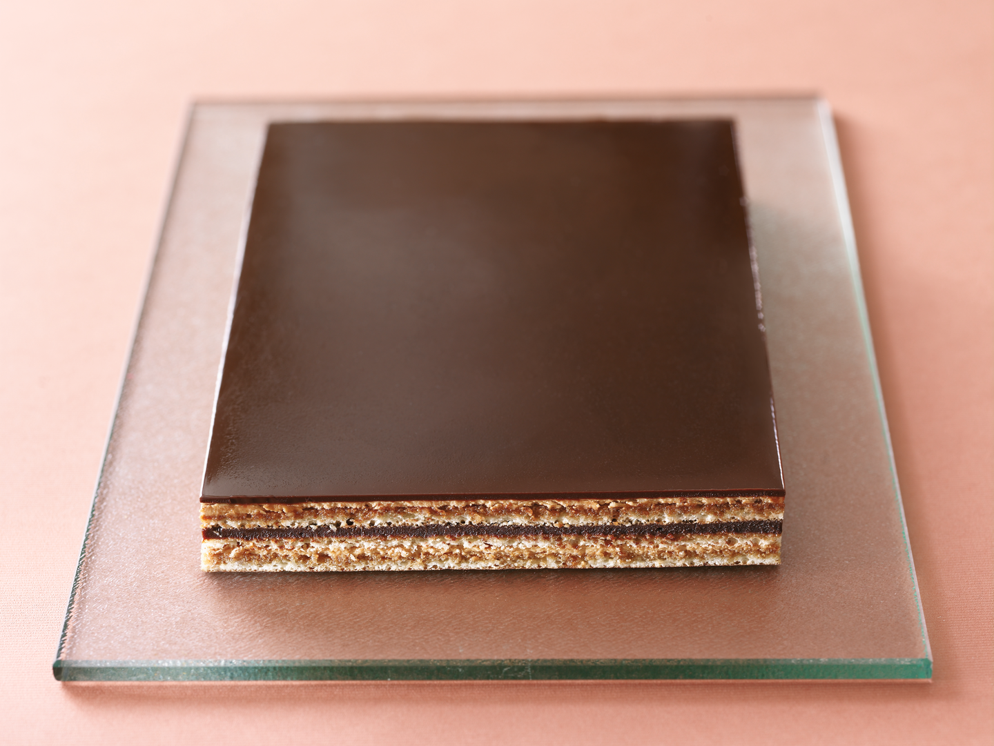 Suklaakuorrutettua mantelikakkua kahvikreemi- ja suklaaganachetäytteellä.