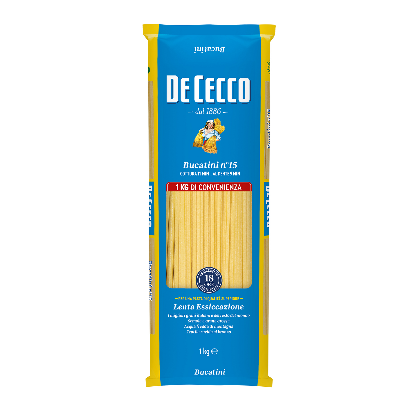 De Cecco Bucatini on durumvehnästä valmistettu korkealaatuinen pasta. Italialainen De Cecco on premium-pastakategorian markkinajohtaja maailmanlaajuisesti ja yksi Italian suosituimmista pastamerkeistä. Pastat valmistetaan laadukkaista raaka-aineista uniikein valmistusmenetelmin, mikä takaa että pastat ovat ominaisuuksiltaan omaa luokkaansa.
