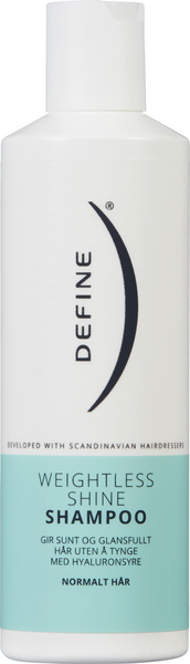 Define Weightless Shine Shampoo sisältää hyaluronihappoa, joka hoitaa hiuksia ja tekee niistä kiiltävät. Jättää hiukset kevyiksi latistamatta niitä. Define Weightless Shine Shampoo on vegaaninen, eikä se sisällä silikonia. Define-tuotesarja on kehitetty yhteistyössä skandinaavisten kampaajien kanssa.