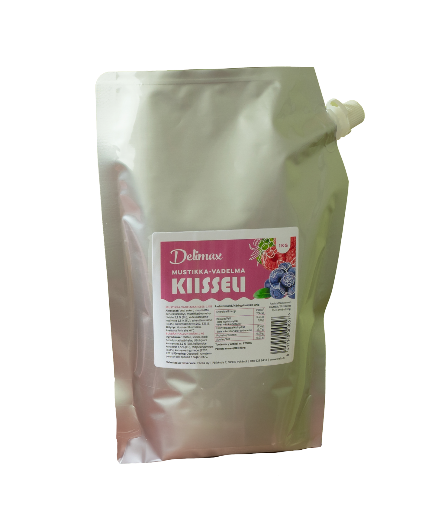 Vesi, sokeri, muunnettu perunatärkkelys, mustikkatäysmehutiiviste 2,2 % (EU), vadelmatäysmehutiiviste 1,5 % (EU), sakeuttamisaine (E415), säilöntäaineet (E202, E211).