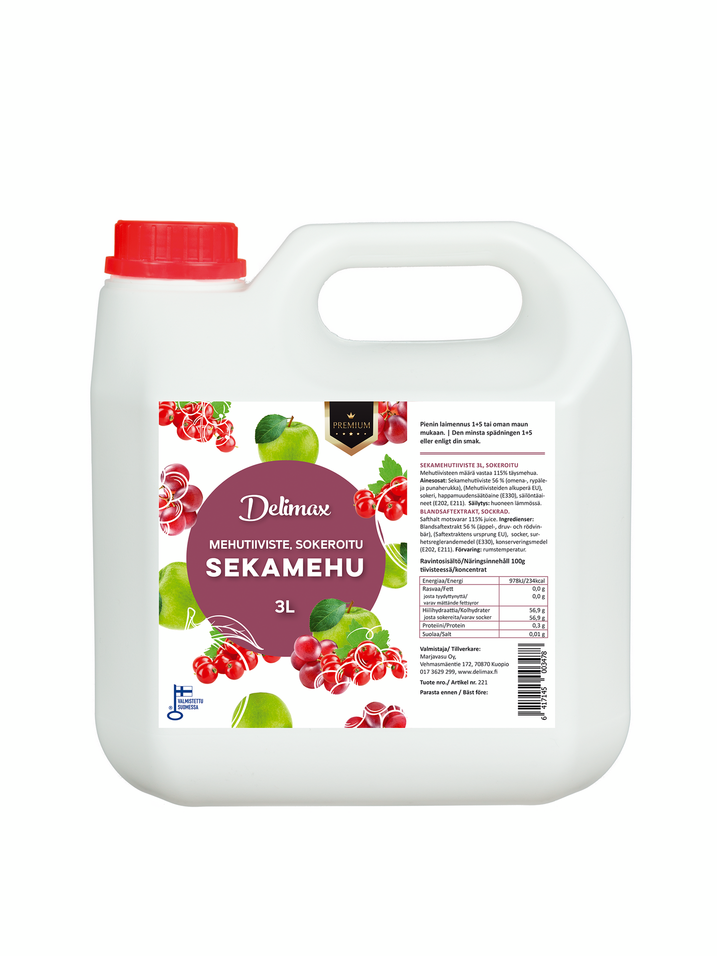 Delimax Sekamehutiiviste 3 l on kanisteriin pakattu, sokeroitu mehutiiviste, joka sisältää omenaa, punaista rypälettä ja punaherukka. Tuote on valmistettu Suomessa Feelian tehtaalla
