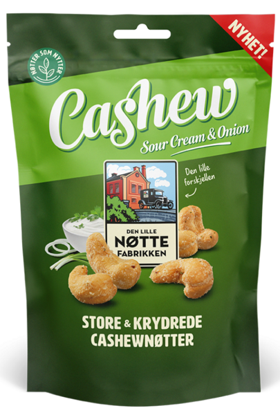 Den Lille Nøttefabrikken SourCream & Onion Cashew sisältää korkealaatuisia, paahdettuja cashewpähkinöitä suositulla sourcream & onion maustesekoituksella. Nämä napostelupähkinät ovat täydellinen herkku leffahetkeen tai kokeile salaatin joukossa.