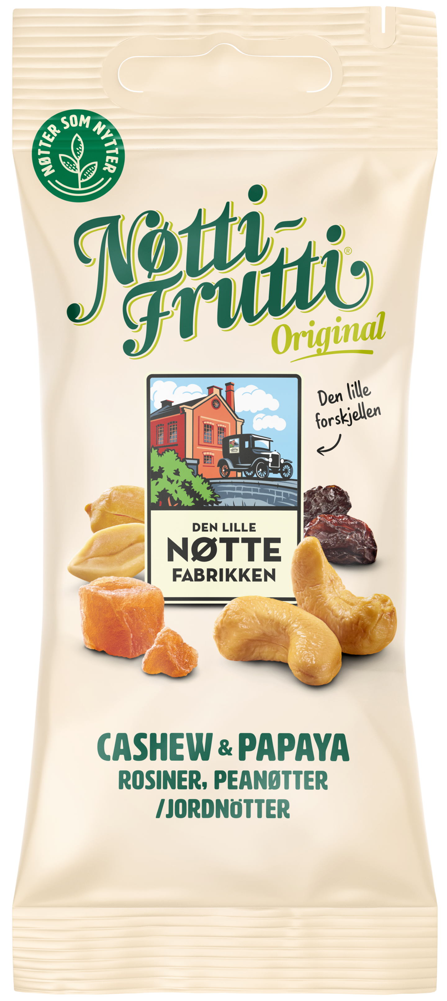 Den Lille Nøttefabrikken Nøtti Frutti cashew & papaija, rusina, maapähkinä sekoitus 50g