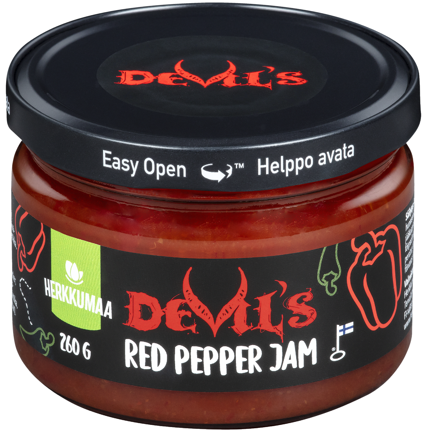 LaktoositonHerkkumaan Devil’s Red Pepper Jam taipuu lähes joka ruuan kaveriksi. Lusikoi tai levitä tätä herkkua kastikkeeksi, lihan tai kalan kaveriksi sekä leipien, toastien ja täytettyjen sämpylöiden kanssa. Jalapenolla tukevoitettu hillo kruunaa halloumin, kanan ja grillatut pihvit.
