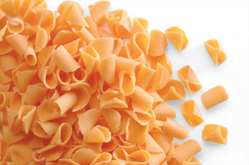 Suklainen koristekihara. Oranssiksi värjätystä valkosuklaasta, jossa valkosuklaan tuoksu ja maku.