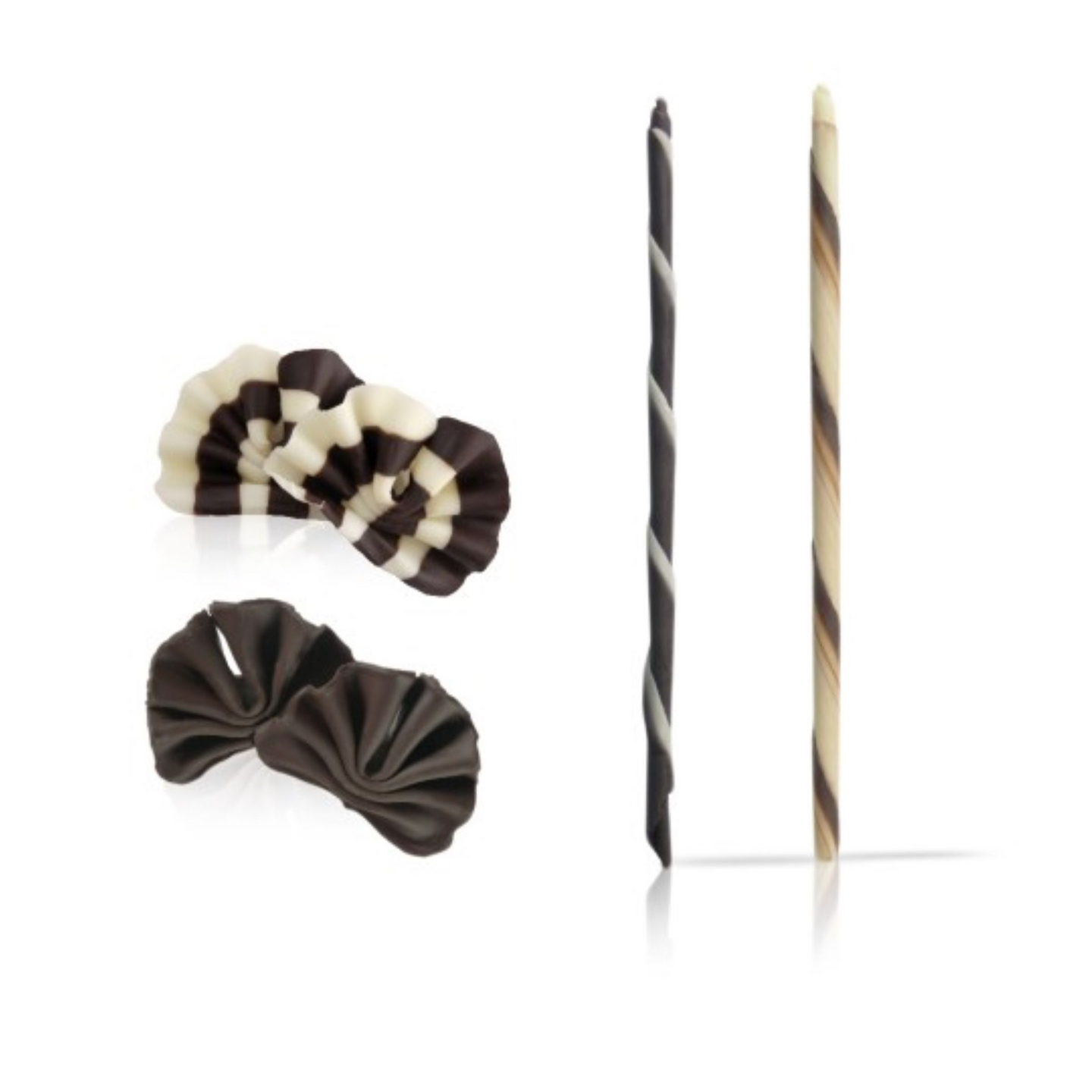 Sulkaakoristevalikoima sisäeltäen tummaa, valko-ja maitosuklaata.