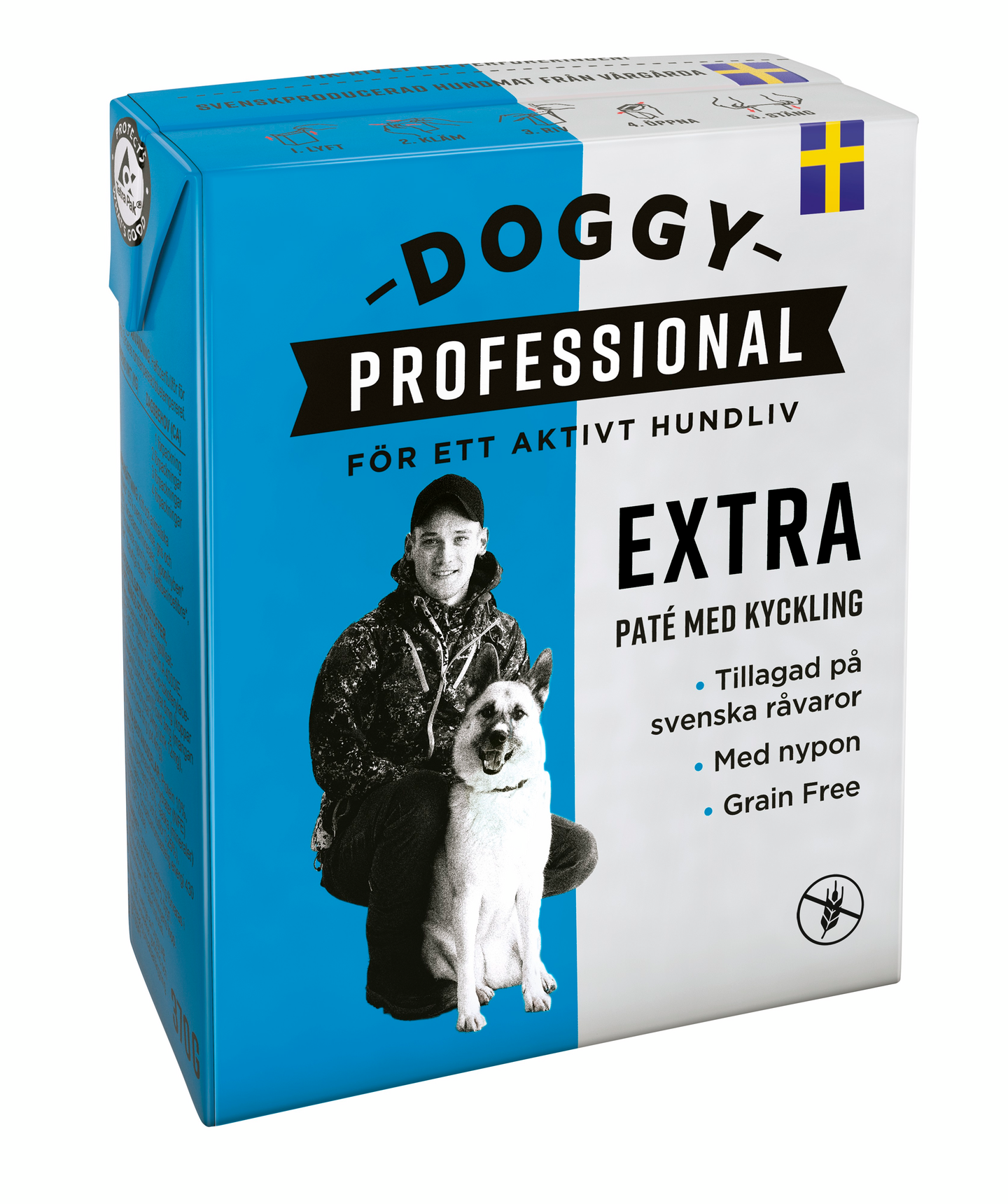 Doggy Professional Extra paté on aktiivisille koirille tarkoitettu täysravinto. Se on erityisesti suunniteltu koirille, joilla on aktiivinen elämäntapa ja jotka liikkuvat paljon, esimerkiksi harrastuksessa tai metsällä. Sopii myös palkkanamiksi tai kuivaruoan kanssa tarjottavaksi.Viljaton, ja herkullinen kanaa sisältävä paté maistuu varmasti koirille joko pelkkänä ruokana, tai osana kuivaruoan kanssa. Ruoassa on paljon energiaa ja siihen on lisätty kaikki tarpeelliset mineraalit ja vitamiinit, joita koirasi tarvitsee. Lisäksi Extra sisältää ruusunmarjaa, jossa on tarvittavia antioksidantteja. Doggy professional märkäruoka on valmistettu huolella valituista raaka-aineista Ruotsissa ja sen lihan ja lihaperäiset tuotteet ovat Ruotsista. Ruokaan ei ole lisätty mitään turhia lisäaineita eikä sokeria. Liha- ja eläinperäisten aineiden pitoisuus on 65% (ruotsalaista nautaa, sikaa ja kananpoikaa). Tölkkiä ympäristöystävällisempi Tetra Recart on helppo avata ilman saksia ja se voidaan sulkea. Säilytys avattuna jääkaapissa.