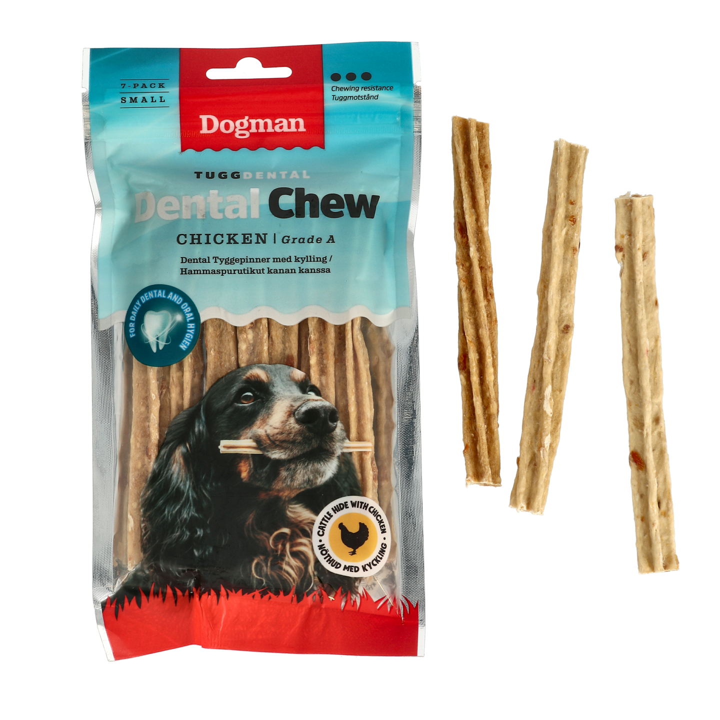 TuggDental on uniikki hampaidenhoitotuote, jossa on sekoitettuna naudannahkapuruluuta ja maukasta kananlihaa. Täysin ilman viljaa tai lisättyä sokeria. Funktionaalinen tähdenmallinen läpileikkaus puhdistaa syvältä hampaiden välistä. Sisältää aktiivisen plakkia vähentävän ainesosan. A-luokan kanalla.