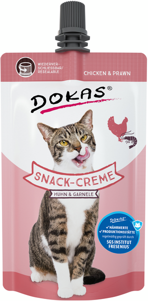 Dokas välipalatahna soveltuu kuivaruuan päälle tuomaan lisämakua tai herkuksi aterioiden välillä. Uudelleensuljettava tuubi säilytetään jääkaapissa ja käytetään n. 4 päivän sisällä avaamisesta. Makuna kana-katkarapu.