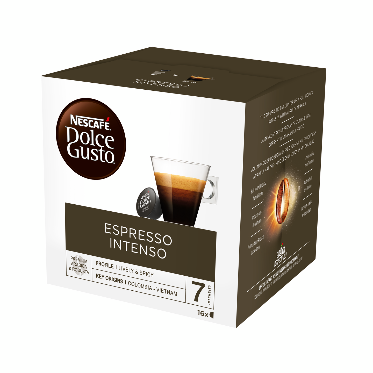 Tutustu NESCAFÉ Dolce Gusto Espresso Intensoon – se on vahva, keskipaahtoinen kahvi. Tässä lyhyessä kahvijuomassa on hedelmäinen ja mausteinen aromi, pehmeä runko ja runsas, samettinen crema. Ammattitaitoiset kahviasiantuntijamme ovat yhdistäneet Nescafé Dolce Gusto Epresso Intenso -kahviin hedelmäisiä eteläamerikkalaisia Arabica- ja Robusta-kahvipapuja ja luoneet tämän maistuvan ja aromikkaan kahvin. Voimakkuus 7/11.