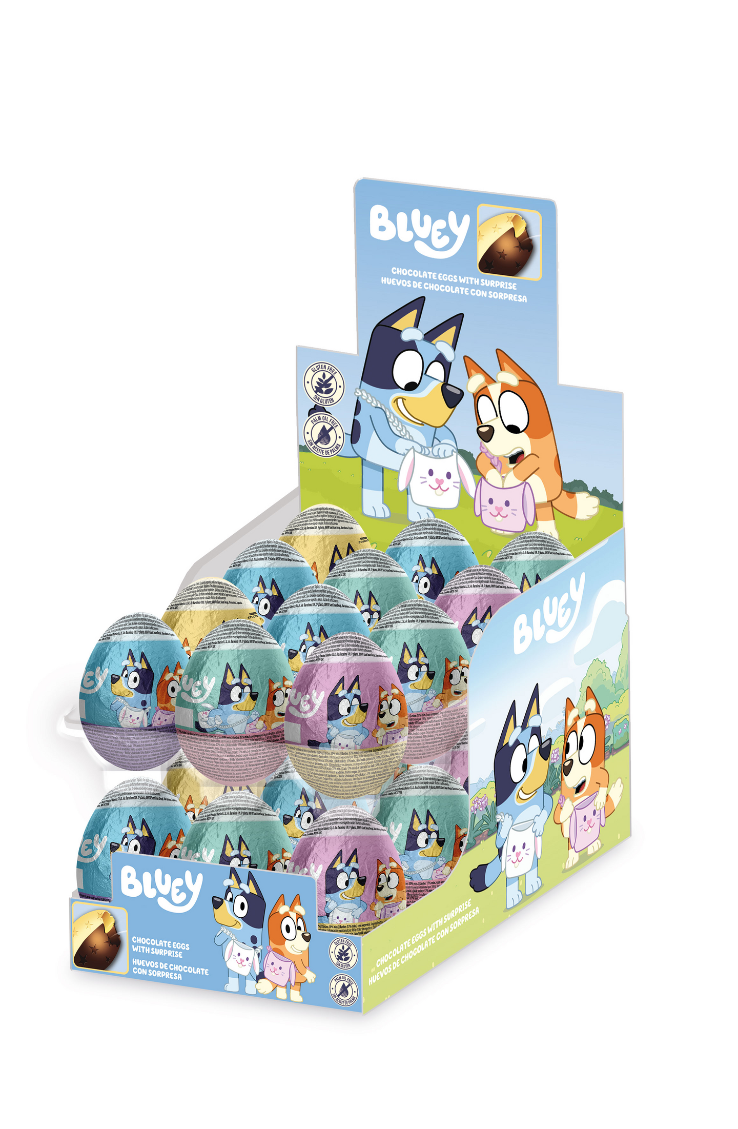 GluteenitonHerkullinen yhdistelmä maito- ja valkosuklaata sekä sisällä Bluey-aiheinen yllätys!