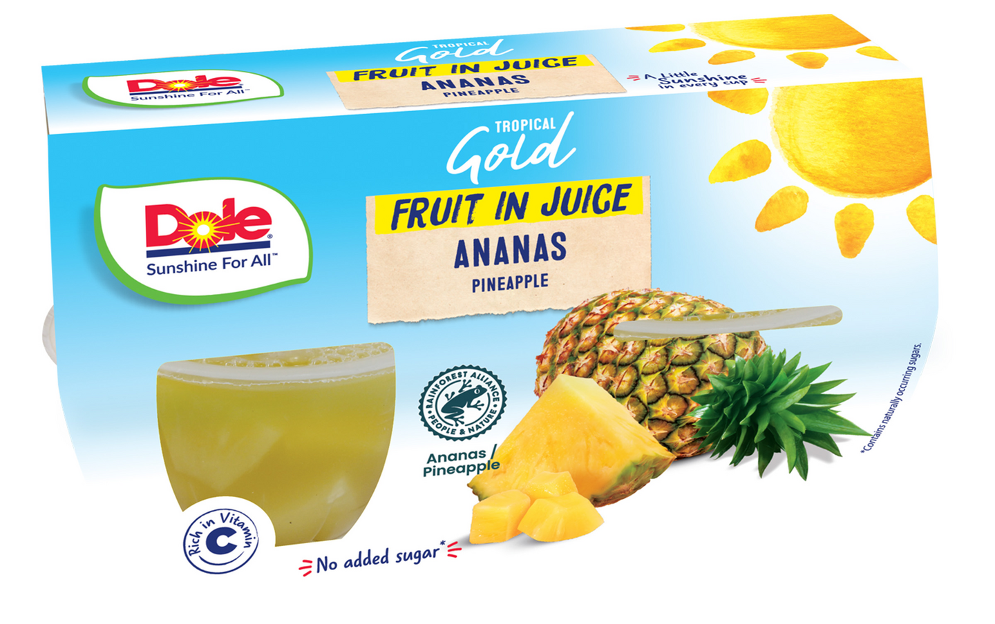 Dole Tropical Gold -hedelmäkupit sisältävät luonnollisesti makeaa ananasta, joka on viljelty aurinkoisilla trooppisilla mailla. Jokainen kuppi sisältää 4 pientä annosta raikasta ja mehukasta ananasta. Hedelmäkupit ovat täydellinen välipala, joka tarjoaa herkullisen vaihtoehdon kiireisiin päiviin. Kokeile Dole Tropical Gold -hedelmäkuppeja ja anna makean ananaksen piristää päivääsi!