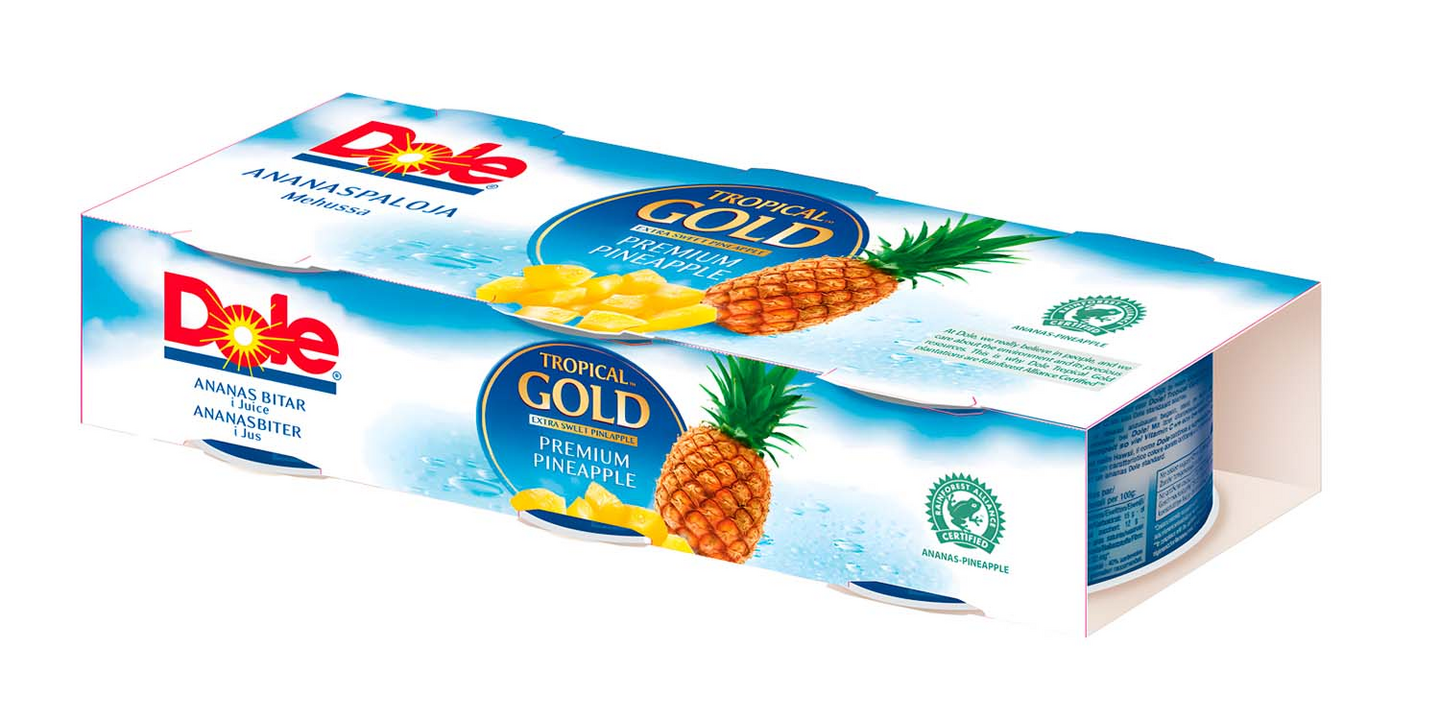 Dole Tropical Gold on luontaisesti makeampi ananas. Kullankeltaisia, makeita, aina oikeaan aikaan kypsänä poimittuja ananaspaloja. Käytä ananasta leivonnassa, ruoanlaitossa, lisukkeena tai nauti sellaisenaan! Nyt Dole-ananas kätevässä kolmen purkin monipakkauksessa!