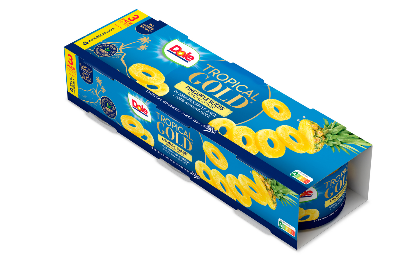 Dole Tropical Gold on luontaisesti makeampi ananas. Kullankeltaisia, makeita, aina oikeaan aikaan kypsänä poimittuja ananasviipaleita. Käytä ananasta leivonnassa, ruoanlaitossa, lisukkeena tai nauti sellaisenaan! Nyt Dole-ananas kätevässä kolmen purkin monipakkauksessa!