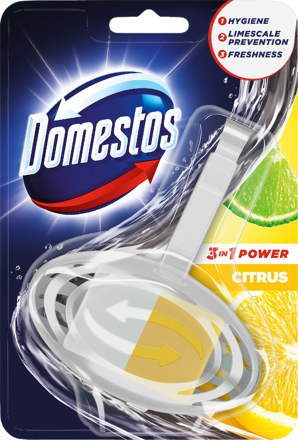 Kokeile nyt itse! Pidä WC-istuin raikkaana ja puhtaana helposti Domestos 3in1 Citrus fresh WC-raikastimen avulla. Taita ripustin ulos, riko muovitiiviste ja ripusta WC-raikastin WC-istuimen reunaan siten, että raikastin osuu vesivirtaukseen aina kun vedät WC:n.