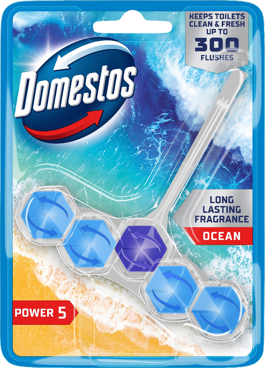 Raikasta jokainen WC-huuhtelusi Domestos Power 5 Ocean WC-raikastimella! Paras WC-raikastimemme ei tarjoa vain yhtä, vaan jopa viisi erilaista ominaisuutta. Power 5 Ocean WC-raikastin tuo jokaisella huuhtelulla WC-pönttöösi runsaan vaahdon, kiiltävän puhtauden ja raikkaan pitkäkestoisen tuoksun. Se myös ehkäisee WC-pöntön likaantumista. Kokeile ja nauti miellyttävän raikkaasta meren tuoksusta jokaisella huuhtelulla.