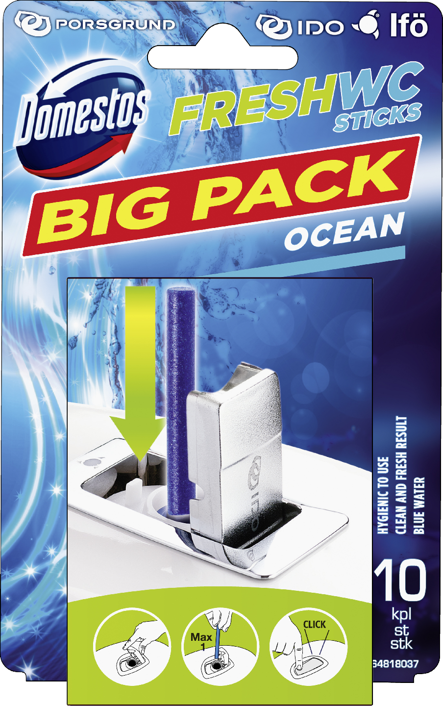 Domestos Fresh Ocean WC-raikastintikut (10 kpl paketti) on WC:n puhdistusmenetelmä, joka pitää WC:si puhtaana sekä hygieenisenä ja saa kylpyhuoneesi tuoksumaan hyvältä. Domestos Fresh Ocean WC-raikastin värjää huuhteluveden raikkaan siniseksi. Nautit raikkaasta meren tuoksusta jokaisella huuhtelulla. Tuote vähentää kalkinmuodostusta, saostumia ja epämiellyttäviä tuoksuja WC:ssä ja kylpyhuoneessa. Tuloksena puhdas, hygieeninen ja hyväntuoksuinen vessa. WC-raikastintikut ovat hygieenisiä käyttää. Aseta raikastintikku suoraan huuhtelupainikkeen alla olevaan raikastinkoteloon. Domestos WC-raikastintikut on tehty erityisesti huuhtelusymboleilla varustettuihin IDO WC-istuimiin. Domestos WC:n puhdistusaineet on suunniteltu pitämään WC:si ja kylpyhuoneesi puhtaana, hygieenisenä ja raikkaana. Domestos Vessanpuhdistus Fresh Ocean WC-raikastintikut suojaavat sinua ja perhettäsi tehokkaasti WC:ssä leviäviä bakteereja vastaan. Käytä bakteereja tuhoavia aineita aina harkiten ja vastuullisesti. Lue käyttöohje ja pakkausseloste ennen käyttöä. Domestos on tunnettu kodinpuhdistuksen brittiläinen tavaramerkki, joka on auttanut pitämään koteja puhtaana aina 1920-luvulta saakka. Taistelemme paremman hygienian puolesta kaikkialla maailmassa. Domestos osallistuu torjumaan bakteerit myös siellä, missä apua eniten tarvitaan. Yhteistyössä UNICEFin kanssa ja oman kehitysohjelmansa avulla Domestos lisää hygieniatietoisuutta ja auttaa parantamaan sanitaatiota mm. Intiassa ja Afrikan mantereen maissa. Viimeiset kymmenen vuotta olemme torjuneet huonoja saniteettiolosuhteita ja auttaneet 28 miljoonaa ihmistä saamaan puhtaamman ja turvallisemman wc:n. Nyt olemme asettaneet tavoitteemme uudelleen: 100 miljoonaan ihmiseen vuoteen 2030 mennessä. WC-tilojen lisääminen ei riitä. Olemassa olevat WC:t on pidettävä toimintakunnossa varmistamalla, että niitä käytetään, puhdistetaan ja huolletaan oikein. Tämä tarkoittaa positiivisten tapojen luomista tämän sukupolven keskuudessa. Näin rakennetaan oikeanlainen hygieniaperusta tuleville sukupolville.
