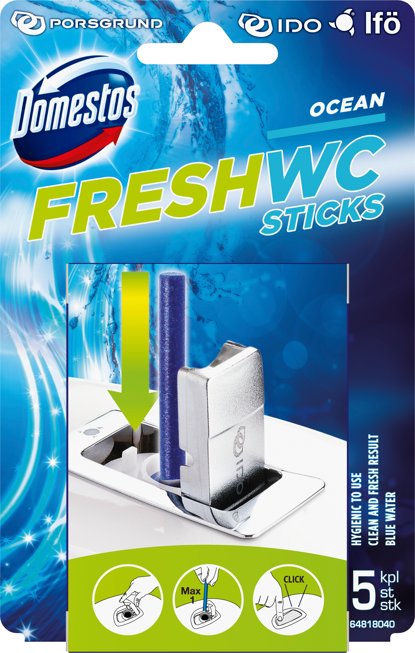 Domestos Fresh Ocean WC-raikastintikut (5 kpl paketti) on WC:n puhdistusmenetelmä, joka pitää WC:si puhtaana sekä hygieenisenä ja saa kylpyhuoneesi tuoksumaan hyvältä. Domestos Fresh Ocean WC-raikastintikut värjäävät huuhteluveden raikkaan siniseksi. Nautit raikkaasta meren tuoksusta jokaisella huuhtelulla. Tuote vähentää kalkinmuodostusta, saostumia ja epämiellyttäviä tuoksuja WC:ssä ja kylpyhuoneessa. Tuloksena puhdas, hygieeninen ja hyväntuoksuinen vessa. WC-raikastintikut ovat hygieenisiä käyttää. Aseta raikastintikku suoraan huuhtelupainikkeen alla olevaan raikastinkoteloon. Domestos WC-raikastintikut on tehty erityisesti huuhtelusymboleilla varustettuihin IDO WC-istuimiin. Domestos WC:n puhdistusaineet on suunniteltu pitämään WC:si ja kylpyhuoneesi puhtaana, hygieenisenä ja raikkaana. Domestos Vessanpuhdistus Fresh Ocean WC-raikastintikut suojaavat sinua ja perhettäsi tehokkaasti WC:ssä leviäviä bakteereja vastaan. Käytä bakteereja tuhoavia aineita aina harkiten ja vastuullisesti. Lue käyttöohje ja pakkausseloste ennen käyttöä. Domestos on tunnettu kodinpuhdistuksen brittiläinen tavaramerkki, joka on auttanut pitämään koteja puhtaana aina 1920-luvulta saakka. Taistelemme paremman hygienian puolesta kaikkialla maailmassa. Domestos osallistuu torjumaan bakteerit myös siellä, missä apua eniten tarvitaan. Yhteistyössä UNICEFin kanssa ja oman kehitysohjelmansa avulla Domestos lisää hygieniatietoisuutta ja auttaa parantamaan sanitaatiota mm. Intiassa ja Afrikan mantereen maissa. Viimeiset kymmenen vuotta olemme torjuneet huonoja saniteettiolosuhteita ​​ja auttaneet 28 miljoonaa ihmistä saamaan puhtaamman ja turvallisemman wc:n. Nyt olemme asettaneet tavoitteemme uudelleen: 100 miljoonaan ihmiseen vuoteen 2030 mennessä. WC-tilojen lisääminen ei riitä. Olemassa olevat wc:t on kiireesti pidettävä toimintakunnossa varmistamalla, että niitä käytetään, puhdistetaan ja huolletaan turvallisesti. Tämä tarkoittaa positiivisten tapojen luomista tämän sukupolven keskuudessa. Näin rakennetaan oikeanlainen hygieniaperusta tuleville sukupolville.