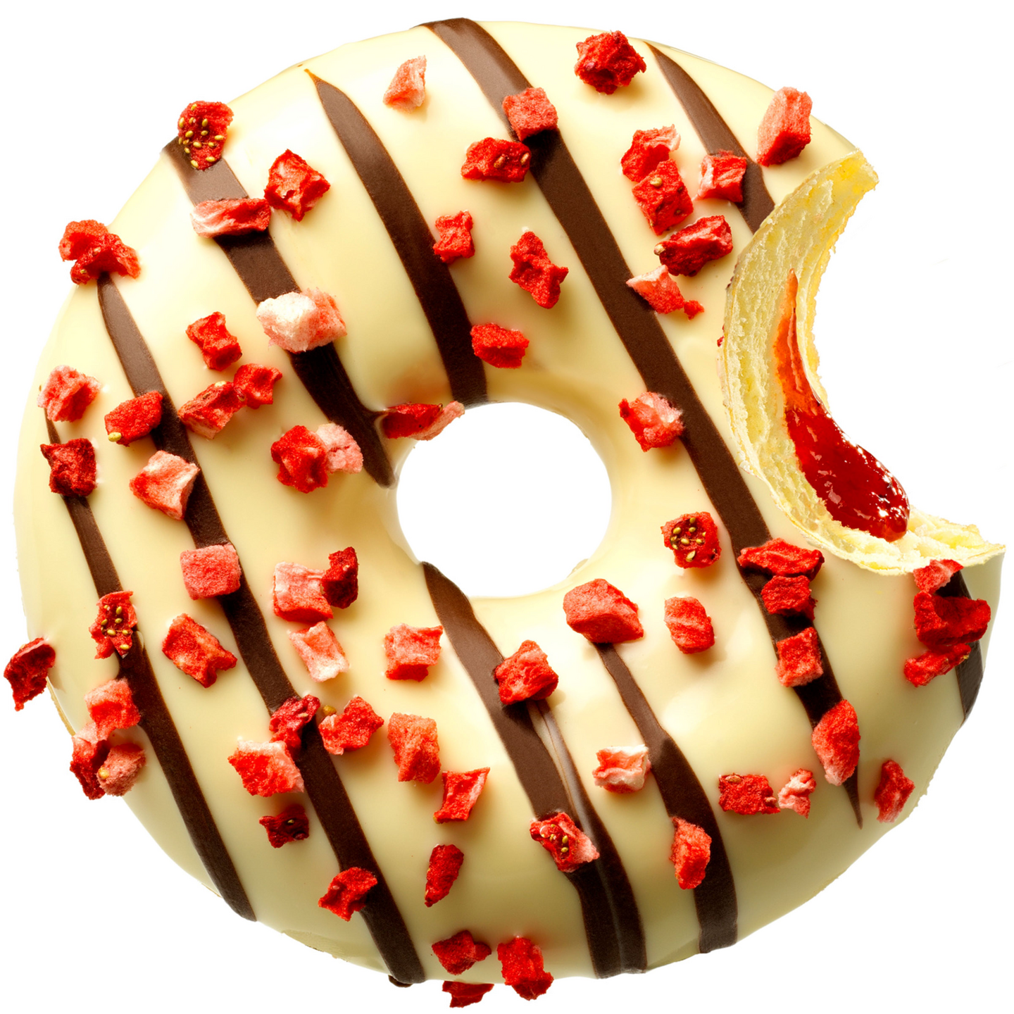 Täytetty donitsi, jonka täytteenä on herkullista aitoa mansikkaa valkosuklaakuorruteella ja mansikanpaloilla.