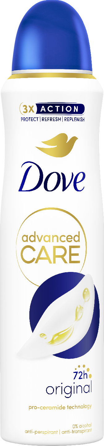 Tiesitkö, että jos ajelet kainalosi, 1/3 siitä mitä poistat on ihoa? Uusi Dove Advanced Care -antiperspirantti, jossa on Pro-ceramide-teknologia, auttaa ihoasi palautumaan jokaisen käyttökerran jälkeen ja tehostaa ihosi luonnollista uusiutumisprosessia, saadaksesi kainaloistasi pehmeämmät ja karvojen ajelua paremmin kestävät. Dove 72h Advanced Care Original antiperspirantti deodorantti spray on täysin alkoholiton ja sen koostumuksessa on mukana kosteusvoidetta, joten se auttaa pitämään ihon pehmeänä ja sileänä kosketukselle. Tämä Dove antiperspirantti tarjoaa helpotusta kainaloille, koska se auttaa vähentämään kainalokarvojen ajamisen aiheuttamaa ihoärsytystä. Kun tarvitset lisäsuojaa hikoilua ja pahoja hajuja vastaan, ota käteesi Dove 72h Advanced Care Original. Tuotteen sisältämä ainutlaatuisen edistyksellinen ja ihoystävällinen Advanced Care -koostumus antaa paitsi tehokkaan suojan hikoilulta, se myös hoitaa ihoasi. Samalla kun se on hellävarainen iholle, se pitää pahat hajut ja hien loitolla jopa 72 tunnin ajan. Dove deodorantti auttaa lievittämään kainaloiden ärsytystä ja pitää kainalot suojattuina ja hoidettuina kaikissa tilanteissa uskomattoman pitkään. Puhtaan ja raikaan tuoksuinen antiperspiranttisuihke sisältää 0 % alkoholia joten se ei ärsytä ihoa. Tuotteen pro-ceramide-teknologia tekee suihkeesta paitsi hikoilulta suojaavan, myös erittäin hoitavan. Se auttaa tekemään kainaloista pehmeät ja sileät. Suihkuta alkoholitonta antiperspiranttideodoranttia tasaisesti kumpaankin kainaloon noin 15 cm:n päässä ihostasi yhdestä kahteen sekunnin ajan. Suihkuta tarpeen mukaan lisää päivän aikana. Saat parhaan deodoranttisuojan, kun varmistat, että kainalot ovat puhtaat ja kuivat ennen antiperspirantin suihkuttamista. Hyvä idea on säilyttää deodoranttia kodin kylpyhuoneen lisäksi esimerkiksi työpaikalla työpöydän laatikossa. Laita myös yksi Doven pakkaus kuntosalilaukkuusi, niin se on aina mukanasi, kun tarvitset hyvää suojaa. Pakkaus on valmistettu 25 % kierrätetystä alumiinista. Metallipurkki on 100 % kierrätettävissä. Dove on PETA Vegan -sertifioitu.