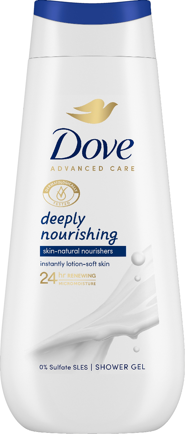 Dove Advanced Care Deeply Nourishing - suihkusaippua puhdistaa hellävaraisesti ja tekee kuivastakin ihosta voidemaisen pehmeän. Aivan kuten jokainen iho on erilainen, myös ihon kuivuus voi näkyä eri tavoin. Onpa ihosi ajoittain tai jatkuvasti kuiva, Dove Advanced Care Deeply Nourishing -suihkusaippua auttaa. Se jättää iholle täyteläisen kosteutetun ja voidemaisen pehmeän tunteen 24 tunnin ajaksi.
