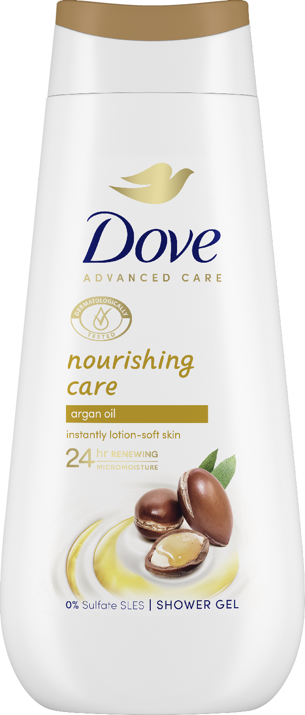 Dove Advanced Care Nourishing Care -suihkusaippua sisältää arganöljyä, joka ravitsee ja kosteuttaa ihoa jo heti ensimmäisellä suihkukerralla. Ylellisen runsas vaahto helpottaa kuivuuden tunnetta välittömästi. Lopputuloksena on pehmeämpi, ravitumpi ja kauniisti hehkuva iho.