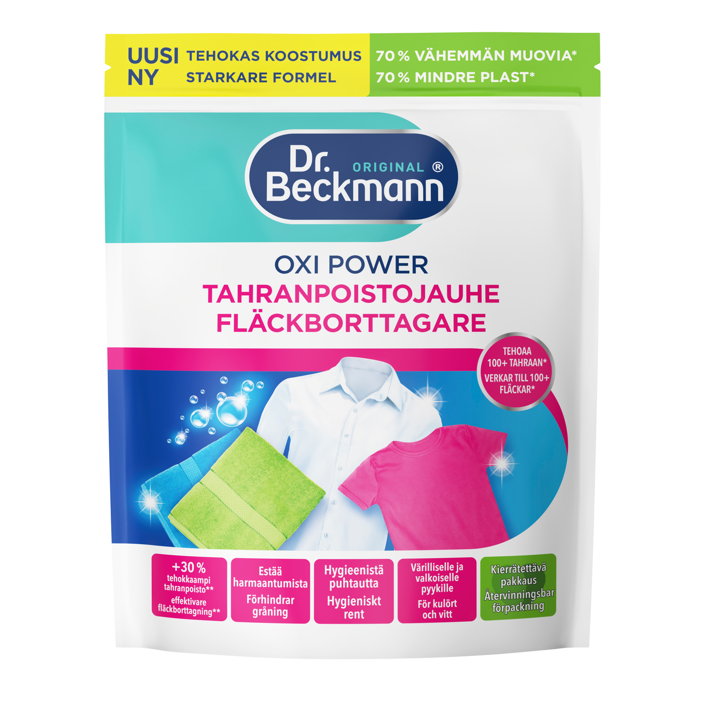 Dr. Beckmann OXI POWER tahranpoistojauhe on tehokas tahranpoistaja, joka toimii yli 100 tahralle. Se estää harmaantumista ja pitää vaatteet uudenveroisina pidempään. Ei sisällä hajusteita, väriaineita tai kloorivalkaisuaineita. Toimii jo alkaen 20 °C. Kevyt muovipakkaus voidaan kierrättää muovi- tai energiajätteenä.