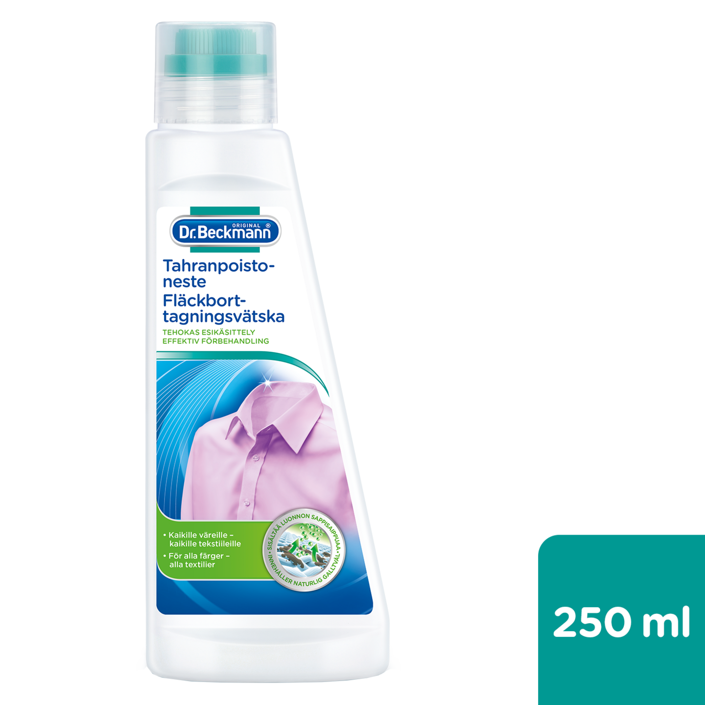 Tehokas esikäsittely tahroille. Dr. Beckmann Tahranpoistonesteessä on erityisyhdistelmä puhdistavia aineita, tahroja irrottavia tehoaineita sekä bio-alkoholia poistavat monenlaiset tahrat. Hellävarainen väreille ja tekstiileille. Sopii myös aroille tekstiileille. Ei sisällä hajusteita, väriaineita eikä valkaisuaineita. Tehoaa mm. rasva-, kastike-, suklaa-, meikki-, huulipuna-, lastenruoka-, hedelmä-, vihannes-, punaviini-, kahvi- ja teetahroihin. Erinomainen kauluksiin ja hihansuihin. Pehmeä harjapää auttaa jopa pinttyneiden tai kuivuneiden tahrojen poistossa.