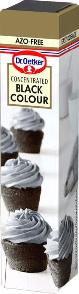 Musta elintarvikevärigeeli. Geeliväri on nestemäistä väriä paksumpaa, kuitenkin helposti pursotettavaa. Geeliväri on pakattu yksittäiseen tuubiin, josta väriä on helppo annostella tipoittain. Väri kannattaa lisätä kermavaahtoon tippa kerrallaan vasta vaahdotuksen lopussa, jotta kerma ei juoksetu. Näin värin määrän pystyy arvioimaan tarkemmin ja lopputulos on halutun värinen. Vahvemman mustan värin saa lisäämällä taikinaan tai kuorrutteeseen kaakaojauhetta. Tuote on vegaaninen.