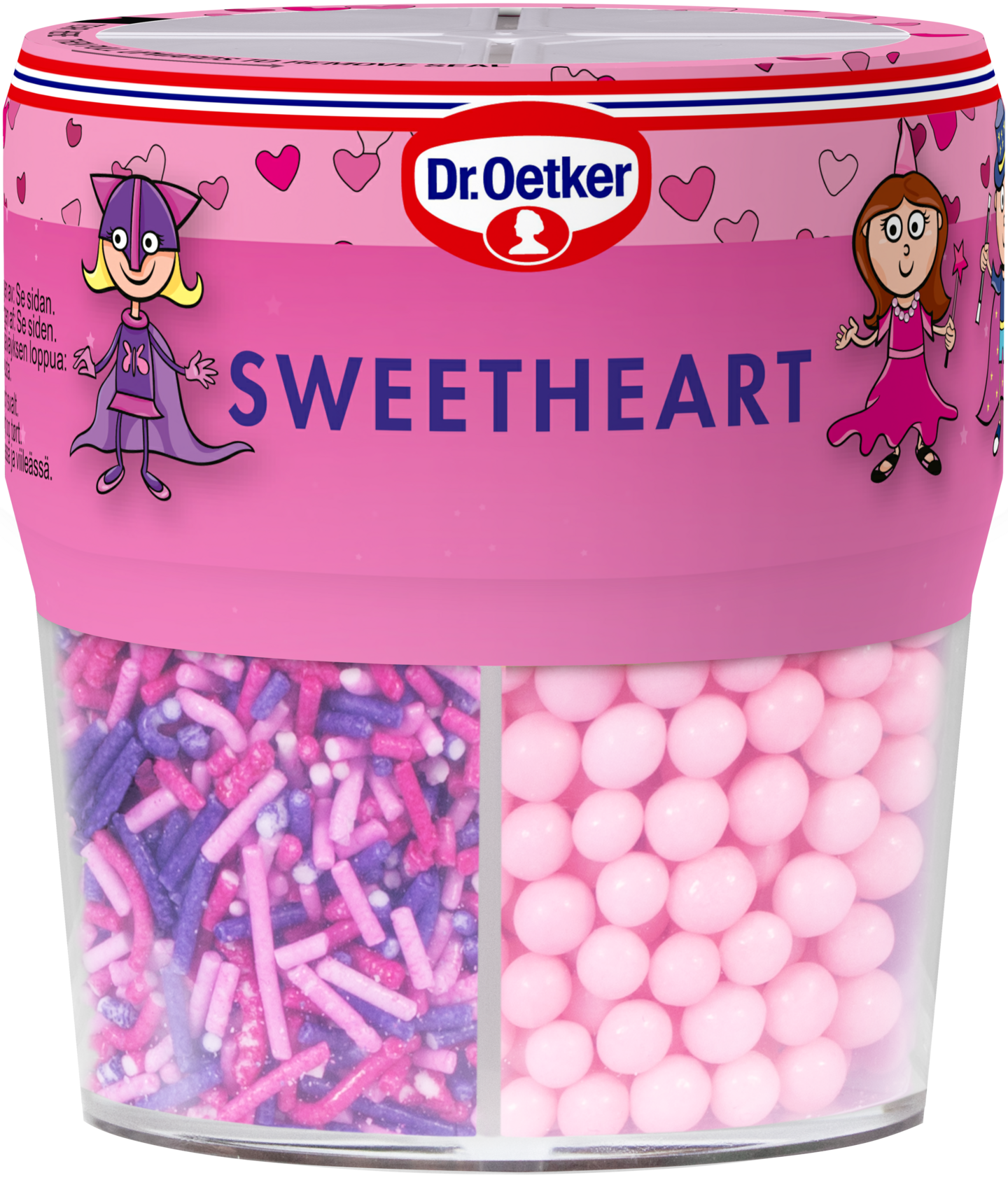 Sweetheart-koristerakeet sisältävät prinsessojen ja prinssien ystävän lempikoristeet vaaleanpunaisina, violetteina ja valkoisina. Vaaleanpunaisia pehmeitä helmiä, vaalenpunaisia, violetteja ja valkoisia sydämiä, strösseliä ja nonparelleja.